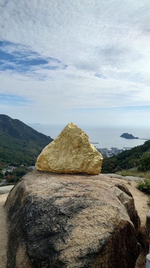 古来より大きな石は神聖なものの象徴で、それにまつわる儀式も多く伝えられてきた。しかし現代では開発工事などにおいて石は逆に障害物として見られ、取り除くべきものとなっている。作家は、韓国で仏像を作る材料のひとつである金箔を石に貼り、仏陀が悟りを開き体が光っている様子を作品に落とし込む。