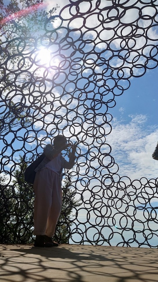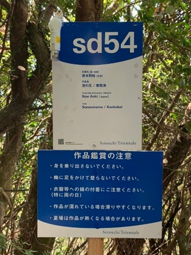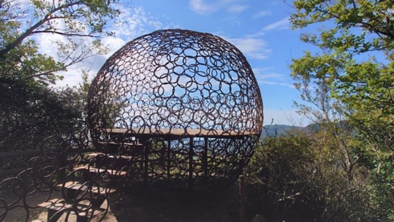 何処かの番組でこの作品の制作過程みたいのをやっていて気になっていた、作品が設置されているのが道路から階段と山道を歩いて上がること約200mの寒霞渓の瀬戸内海を望む林の窓みたいなところに設置されていた、テレビの画面からでは実際の作品の10分の1も伝わらないと思った。作者の言う「鉄の球体のなかに入って雄大な自然を味わう」は人が居ない時に真ん中で座禅を組み味わいたいと思わせる想像以上に素晴らし作品だった。これは常設だとの事なので機会があれば又訪れてみたい。