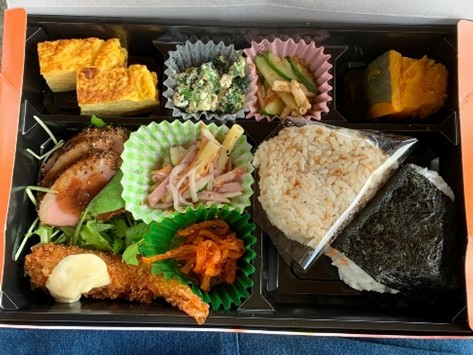 少し早い目の寒霞渓ロープウエイ駅展望デッキで昼食を取る。今回も「福むすび」さんの弁当を頂いた。春は海辺で今回は山頂での食事となった、よく歩いて相変わらずの旨い弁当に大満足!!。