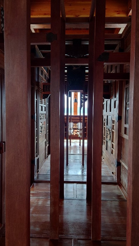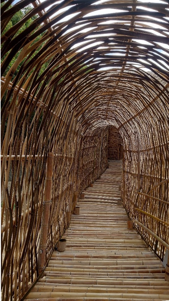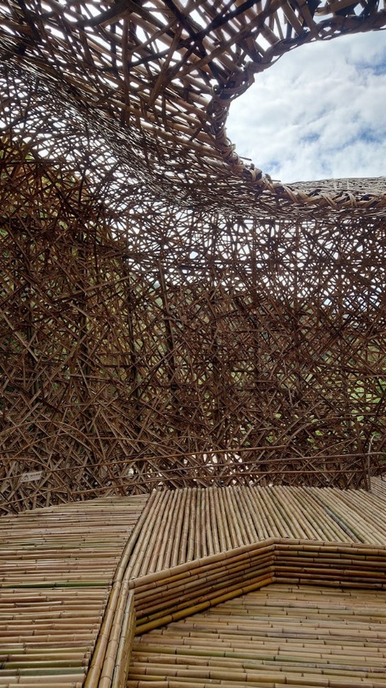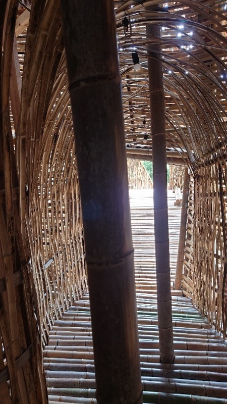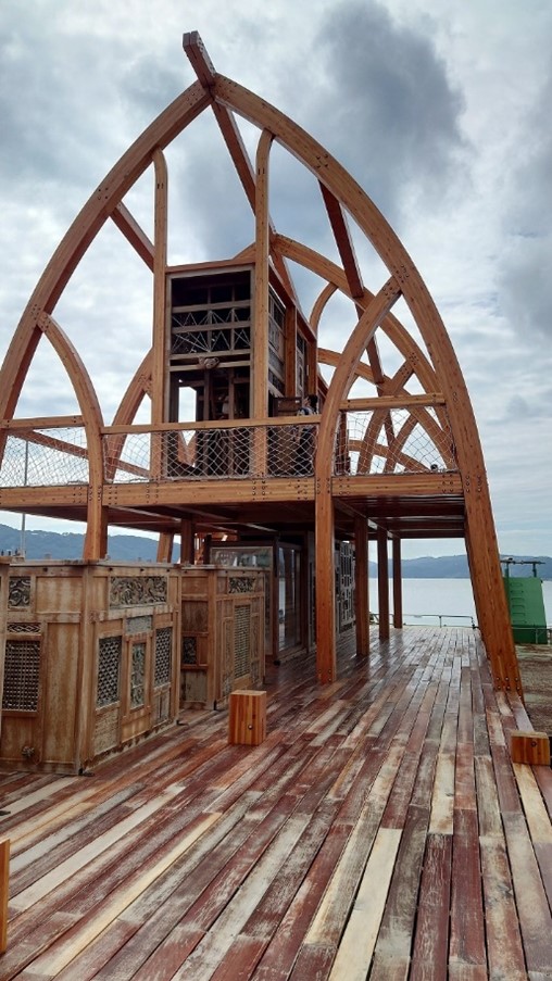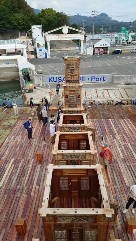 中国で廃棄された家具や建具を集めて修復して組み合わせ、さらに中国の伝統技法で連結することで瀬戸内海に浮かぶ木造構造体をつくる。作家の記憶と現代社会の分断や混乱が相まって表現されている。外側のアーチ型の構造は、船の船体構造を逆さまにしたもので、世界中の観客とつながることで人と人の壁が解消されることを願っている。