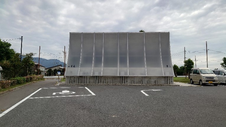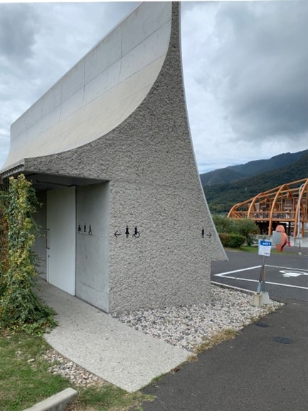 地元で採掘された花こう岩と半透明の壁によるアートトイレ