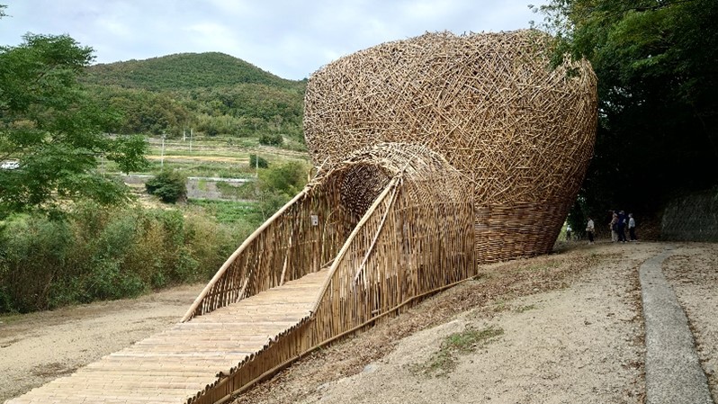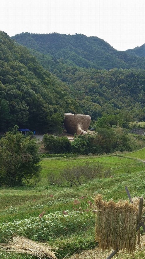 この作品は幹線道路から約300m坂を下って川を渡ったところにこの作品がある、山裾に竹籠のようなものが見える。