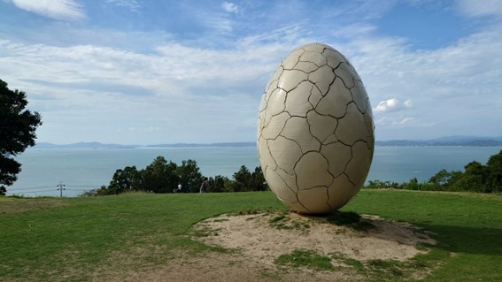 高さ3.7m、幅2.4mの陶でできた作品。卵には草が生えて命を宿す。