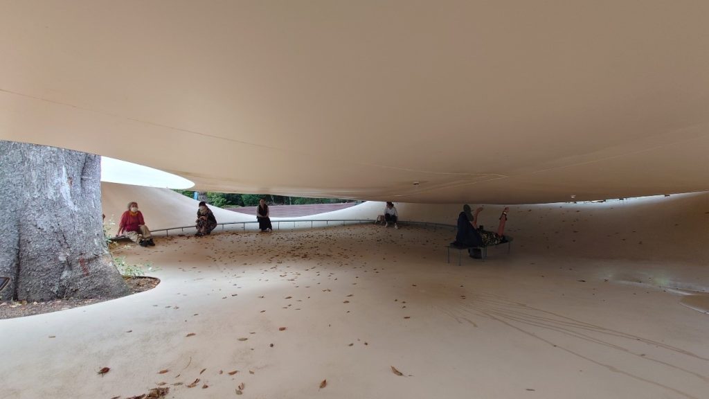 晴季にも訪れたここは落ち着く先かも。鉄板ミルフィーユの間に居る無柱空間の居心地は何じゃらほい!。ツアー疲れでうねった鉄板の上に寝そべる心地よさ、これはタマタマか。作者はそんなこともあるかとベンチや屋根に水まきしたものが垂れてきてその音が響くことも計算済みか。