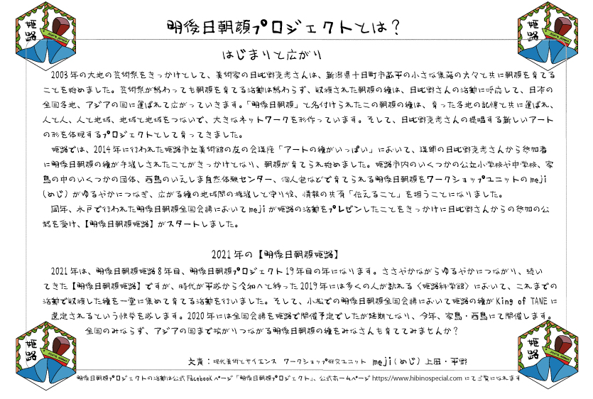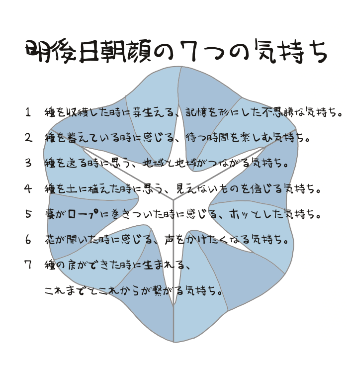 種には2003年莇平、2004年莇平、2005年-2013年水戸、、、と育った地域の履歴が添えられており、包み紙には、「明後日朝顔7つの気持ち」が綴られていました。